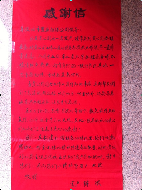 工作人員的熱情細(xì)致的服務(wù)態(tài)度,給陳斌先生及家人留下深刻印象。事后,為了表達(dá)感激之情,陳先生送來親筆抒寫的感謝信,寫道:“在構(gòu)建和諧社會(huì)的時(shí)代里,他們以熱情助人,拾金不昧的精神傳遞著正能量!同時(shí),安慶市房屋置業(yè)擔(dān)保公司的安全保衛(wèi)措施也使我們客戶更加放心!”